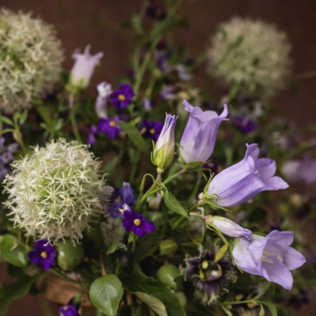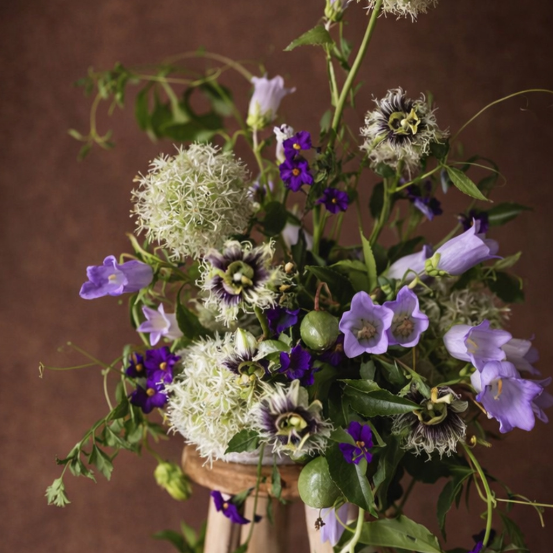 Cette composition florale est une pièce délicate et aérienne, pensée comme un petit jardin sauvage. Les sphères blanches (effet “nuage”) apportent de la légèreté, tandis que les fleurs violettes et lilas créent des touches vibrantes et poétiques. Les feuillages souples et les lignes retombantes donnent du mouvement, comme si la composition respirait naturellement dans l’espace.